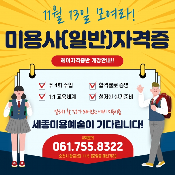 공지사항 세종미용예술 직업전문학원 홈페이지 방문을 환영합니다. 미용사(일반)헤어자격증반 개강안내!! 작성자 : 관리자(test@test.com) 작성일 : 2025-10-28 조회수 : 165 25년도 11월 13일 미용사(일반)자격증반 개강일정 안내~ 파일첨부 : 제목을 입력해주세요 (1).jpg 이전글 다음글 2025년 국비지원 훈련 과정 안내 리스트